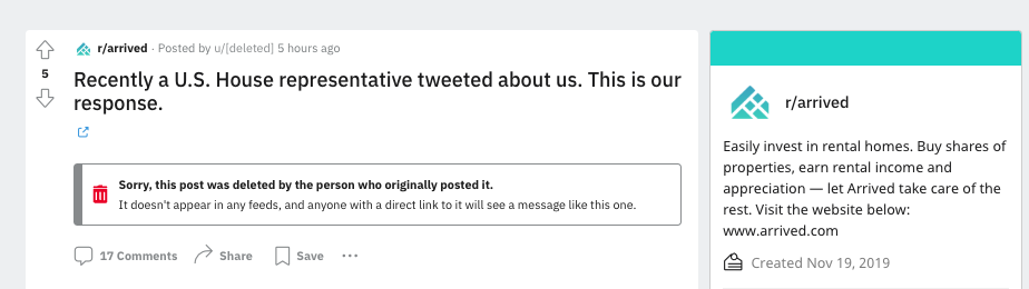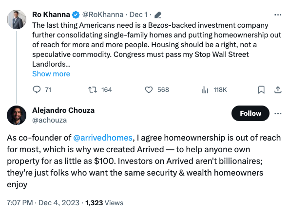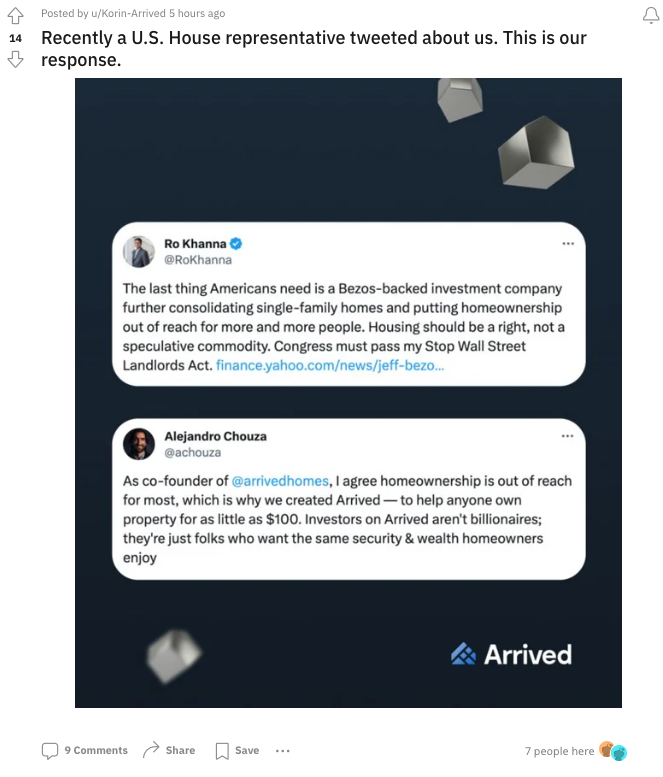 Arrived's Head-of-Investor Relations took to /r/arrived subreddit tonight to highlight a reply on X that their COO/Co-Founder, Alejandro Chouza made to U.S. Congressman Ro Khanna.