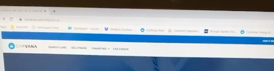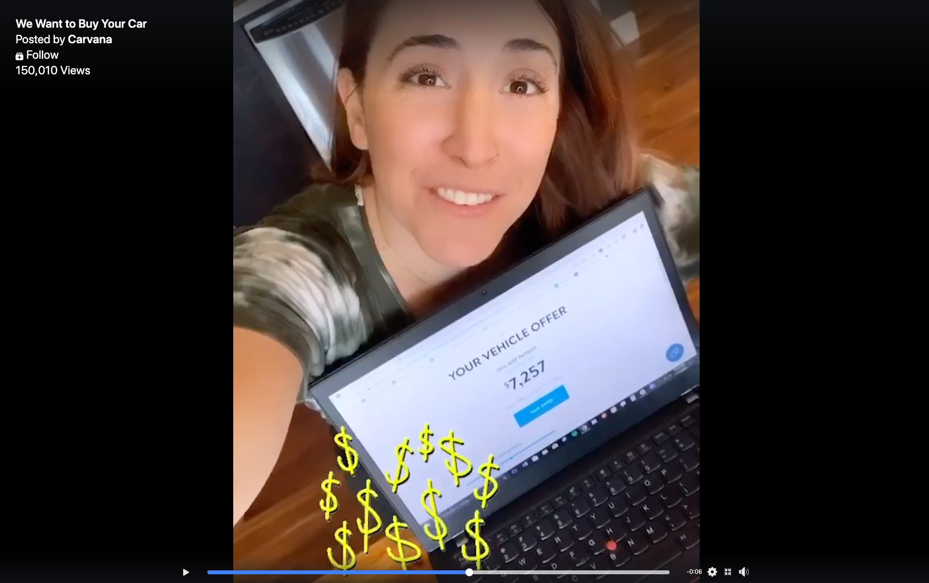 If you haven't noticed, just about every ad has a "Facebook, Instagram Story or Snapchat Story" vibe to it, meant to create a feeling of "someone just like you" is looking to do the exact same thing. It's a fantastic marketing strategy. However, this "Facebooker" forgot that she actually works for Carvana and forgot to hide her bookmarks bar where you can clearly see the following items: