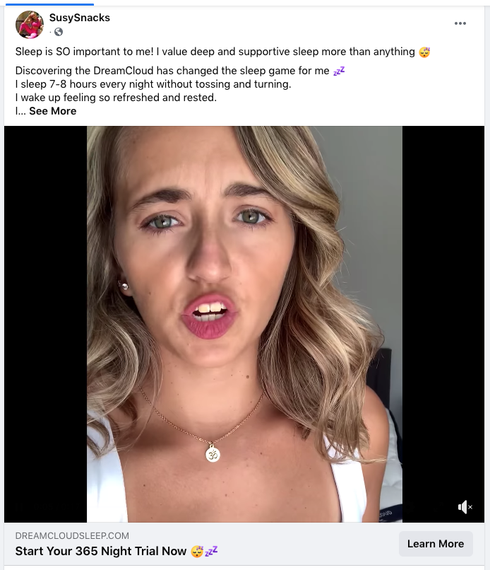 Be sure to always check who's trying to convince you to buy a product. Lets look at SusySnacks and the sponsored AD with Dreamcloud, a mattress company.