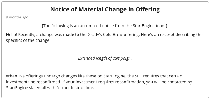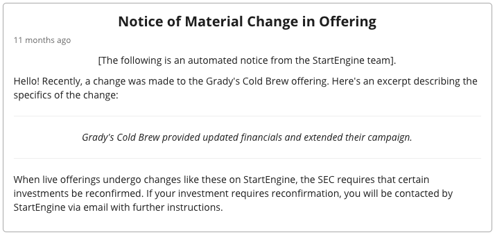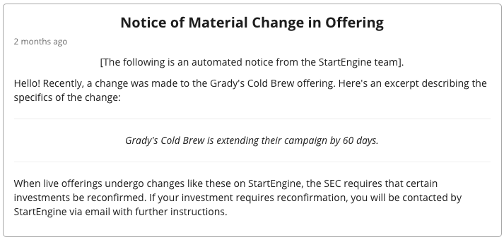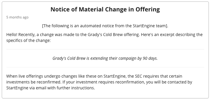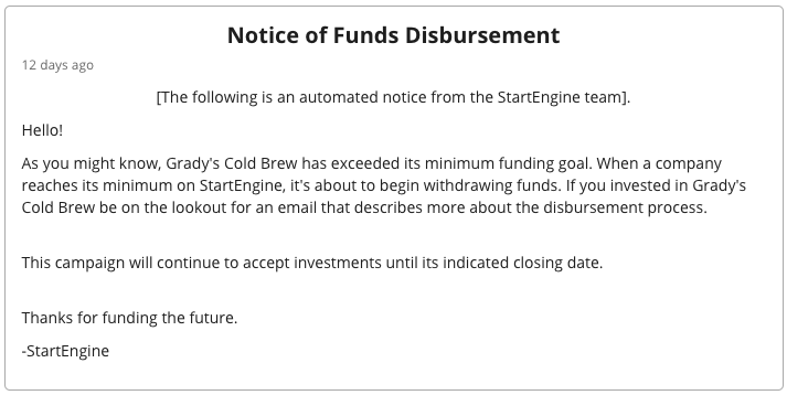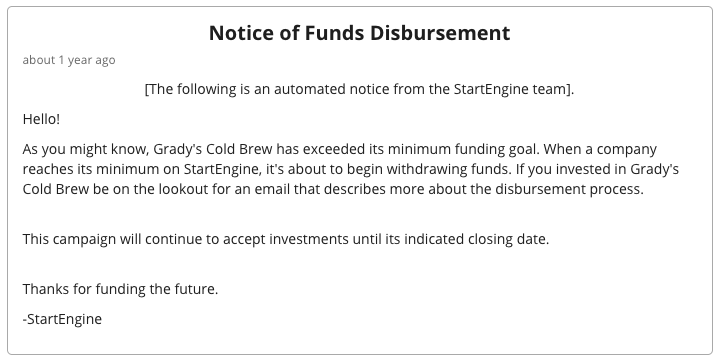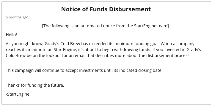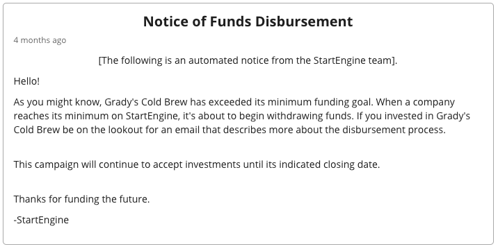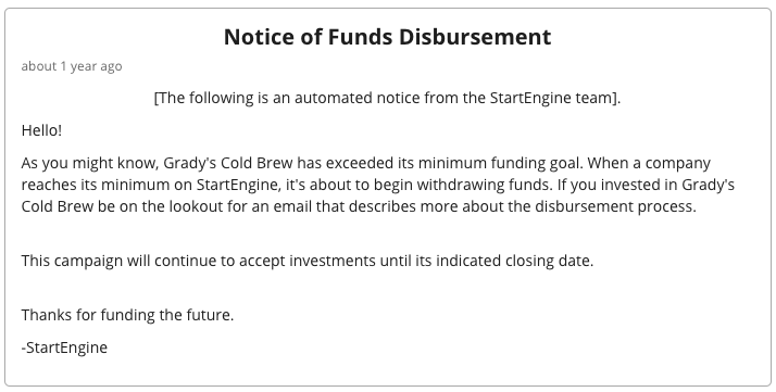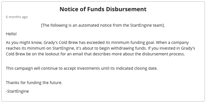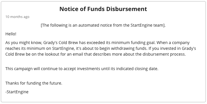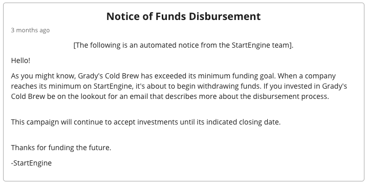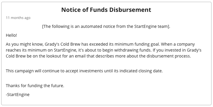 As you might know, Grady's Cold Brew has exceeded its minimum funding goal. When a company reaches its minimum on StartEngine, it's about to begin withdrawing funds. If you invested in Grady's Cold Brew be on the lookout for an email that describes more about the disbursement process.