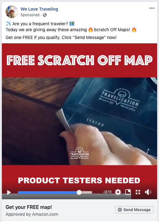 Step one: Create a FB page that runs an AD trying to lure people in for a free Scratch Off Map.