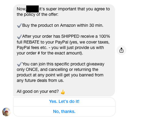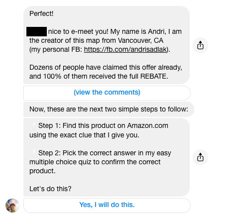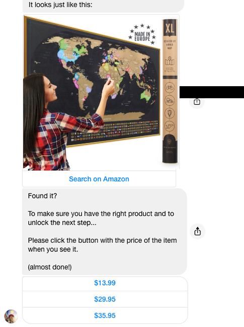 Step two: Automate a Facebook Messenger bot to chat to lure in your customers, help them search for the product on their own, collect their PayPal email, and collect their amazon order number.