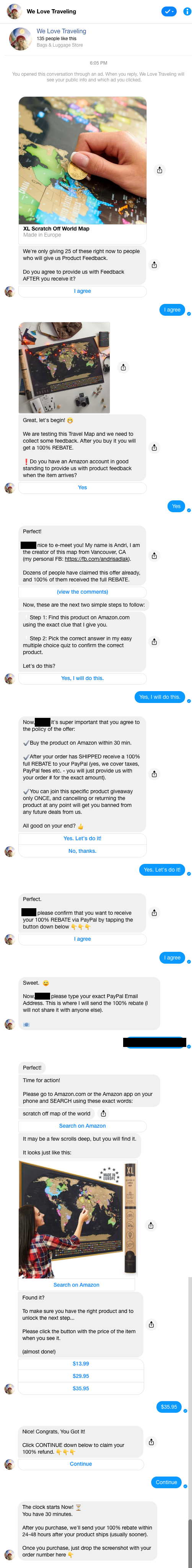 Step two: Automate a Facebook Messenger bot to chat to lure in your customers, help them search for the product on their own, collect their PayPal email, and collect their amazon order number.