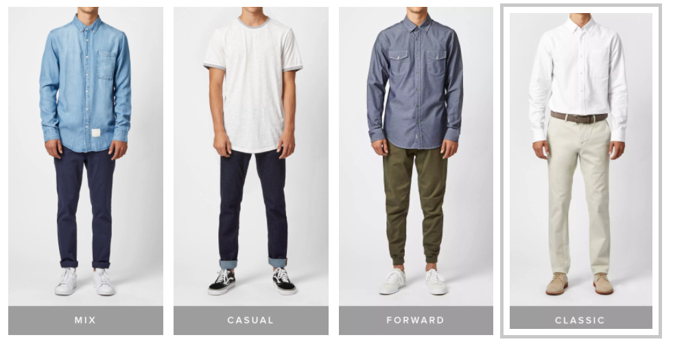 When you sign up it asks you a few questions, 1) What your style is (You pick from there different guys), 2) Your sizes, and 3) What type of jeans you prefer (Skinny, Straight, Loose).