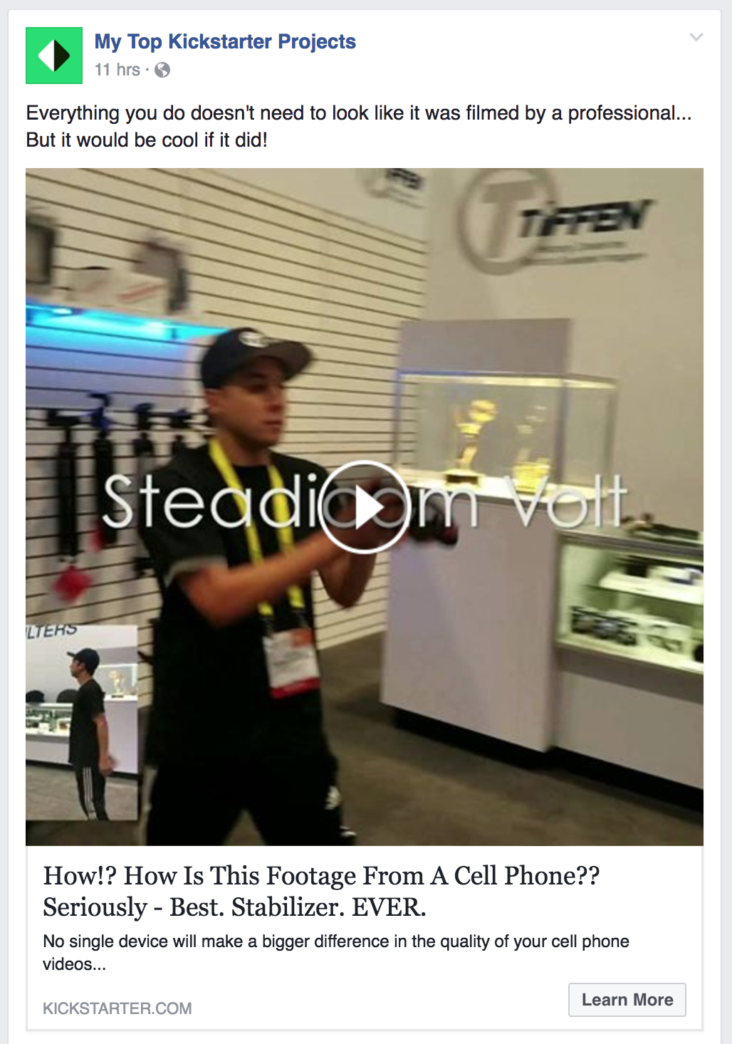 If you've never heard of My Top Kickstarter Projects, they act as a Facebook Page for their company Funded.Today. Companies will hire them to build out a marketing campaign for their Kickstarter campaign. Then, they create a sponsored post with some fantastic click-bait. A catchy headline, some cheesy circle or arrow on an image, and once they secure your click, they accept whatever check or % of the final Kickstarters sales were. I.E. When Kickstarters already are working off of an impoverished or shoestring budget, Funded.Today taking a gigantic cut sure doesn't help.