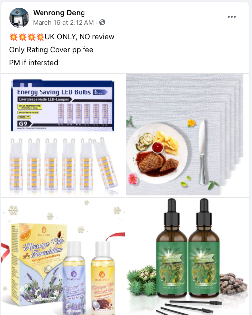 You review it, positive reviews only please, send a screenshot back to them. And then they PayPal or transfer you the total cost of the order to you.